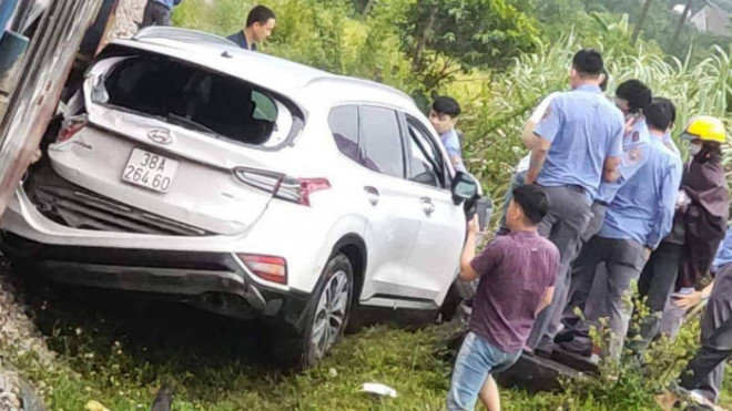 Chiếc ô tô chở 5 người qua đường giao cắt với đường sắt (Hương Khê, tỉnh Hà Tĩnh) không quan sát bị tàu hỏa tông bay xuống ruộng.
