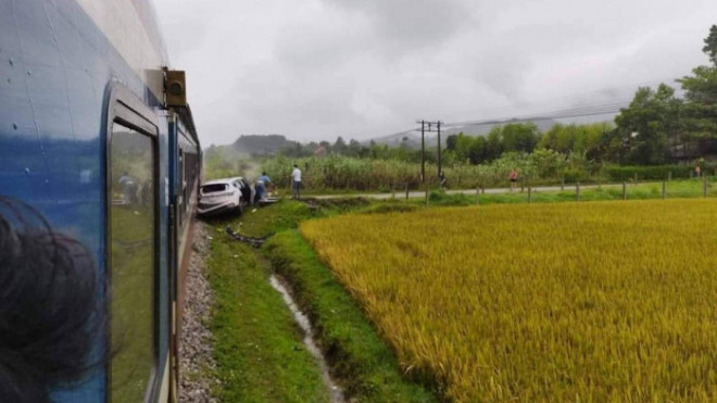 Chiếc ô tô chở 5 người sang đường không quan sát bị tàu hỏa tông bay xuống ruộng