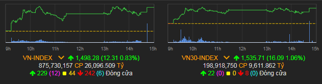 VN-Index tăng 12,31 điểm (0,83%) lên 1.498,28 điểm.