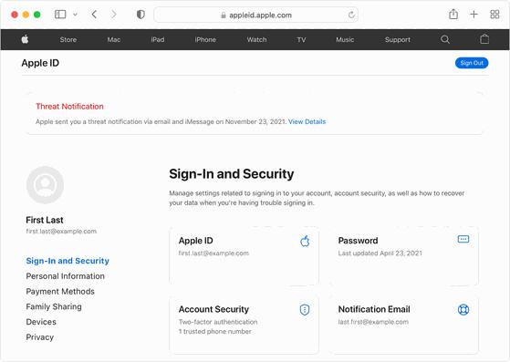 Thông báo sẽ được gửi đến những người dùng bị ảnh hưởng qua email và iMessage, đồng thời Apple cũng hướng dẫn các bước giúp người dùng bảo vệ tài khoản tốt hơn. Bên cạnh đó, khi truy cập vào trang web của Apple, bạn cũng sẽ nhận được thông tin cảnh báo ở đầu trang.