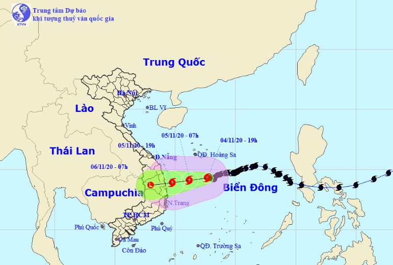 Đến 19 giờ ngày 5/11, vị trí tâm bão ở trên vùng biển từ Quảng Ngãi đến Khánh Hòa. Sức gió mạnh nhất vùng gần tâm bão mạnh cấp 8 (60-70km/giờ), giật cấp 10.