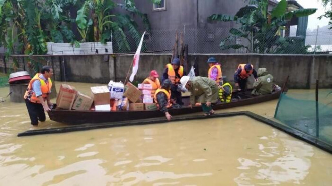 Lực lượng chức năng đang tiếp tế lương thực và nước uống cho 4 xóm bị ngập ở xã Thanh Xuân, Thanh Chương (Nghệ An)
