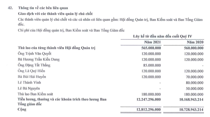 Ngoài khoản thù lao cho chức danh Phó chủ tịch Hội đồng quản trị, trong năm 2021 ông Đặng Tất Thắng cũng nhận được một phần lương, thưởng và các khoản trích theo lương của Ban Tổng giám đốc (hơn 3 tháng làm việc trước khi chuyển sang làm Phó chủ tịch từ ngày 12/4).