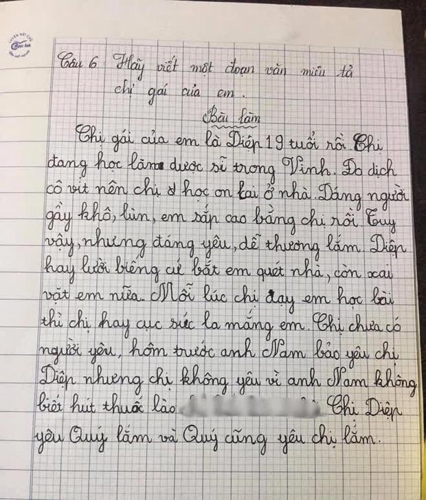 "Chị gái của em là Diệp, 19 tuổi rồi. Chị đang học làm dược sĩ trong Vinh. Do dịch COVID-19 nên chị học online ở nhà. Dáng người gầy khô, lùn, em sắp cao bằng chị rồi. Tuy vậy, nhưng đáng yêu, dễ thương lắm. Diệp hay lười biếng cứ bắt em quét nhà, còn sai vặt em nữa. Mỗi lúc chị dạy em học bài thì chị hay cục súc, la mắng em. Chị chưa có người yêu, hôm trước anh Nam bảo yêu chị Diệp nhưng chị không yêu. Chị Diệp yêu Quý lắm và Quý cũng yêu chị lắm".