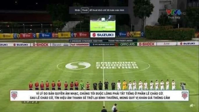 "Vì lý do bản quyền âm nhạc, chúng tôi buộc lòng phải tắt tiếng ở phần lễ chào cờ. Sau lễ chào cờ, tín hiệu âm thanh sẽ trở lại bình thường, mong quý vị khán giả thông cảm" - trên màn hình của kênh Next Sports đã đăng dòng thông báo như vậy ngay trước trận đấu.