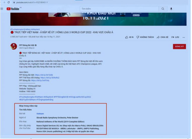 Video trận đấu thuộc Vòng loại thứ 3 của World Cup 2022 giữa ĐT Việt Nam và Ả Rập Xê Út đăng tải trên kênh YouTube "FPT Bóng Đá Việt" đã bị Naxos Digital Services US (thay mặt cho Hãng đĩa Marco Polo) thông báo xác nhận sở hữu bản quyền bản ghi Quốc ca Việt Nam.