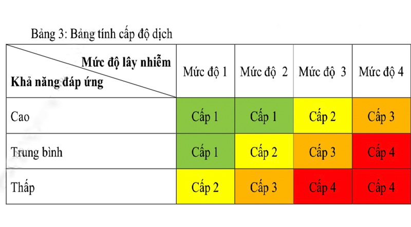 Theo hướng dẫn mới của Bộ Y tế, cấp độ dịch được xác định dựa trên tổng hợp kết quả đánh giá mức độ lây nhiễm (4 mức tại bước 1) và khả năng đáp ứng (3 khả năng tại bước 2), sau đó có thể được hiệu chỉnh bởi chỉ số 1 của tiêu chí 1, theo bảng tính cấp độ dịch.