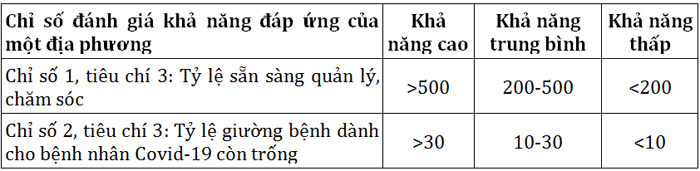 Khả năng đáp ứng của một địa phương là khả năng thấp nhất của chỉ số 1 và 2 tại tiêu chí 3 và được hiệu chỉnh của chỉ số 3 của tiêu chí 3 được liệt kê theo bảng dưới đây: