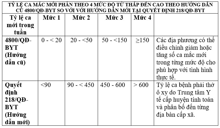Như vậy, so với hướng dẫn cũ (Quyết định 4800/QĐ-BYT), tỷ lệ ca mắc mới vẫn tính trong 1 tuần/100.000 dân. Tuy nhiên, tỷ lệ ca mắc mới phân theo 4 mức độ từ thấp đến cao đã thay đổi.