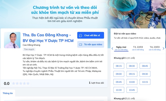 Khoa Phẫu thuật tim trẻ em - Bệnh viện Đại Học Y dược TP.HCM vừa giới thiệu chương trình tư vấn sức khỏe về tim ở trẻ em. Để hẹn lịch bác sĩ tư vấn trực tuyến, bệnh nhân chỉ cần vào đường dẫn https://suckhoe.edoctor.io/suckhoetimmach > chọn “Đặt hẹn ngay” với bác sĩ đang có lịch trống phù hợp với thời gian của mình, rồi đợi bác sĩ liên hệ lại.