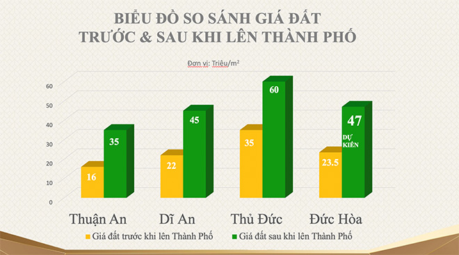 Nhìn lại lịch sử, trước thời điểm lên thành phố giá nhà đất của Thuận An, Dĩ An, Thủ Đức lần lượt là 16 triệu/ m2, 22 triệu/ m2, 35 triệu/ m2, nhưng hiện nay sau khi chính thức lên thành phố giá đất đã tăng 80% - 100%. Cụ thể giá đất thành phố Thuận An 35 triệu/ m2, thành phố Dĩ An 45 triệu/ m2, thành phố Thủ Đức 60 triệu/ m2.