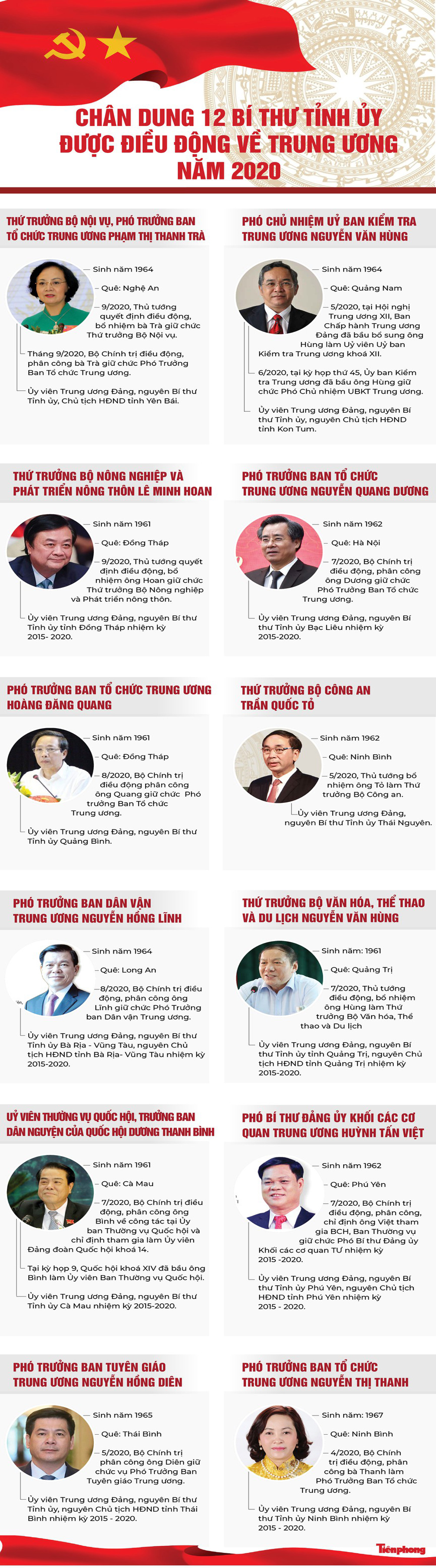 : TVO 24H: 2020-10-01 10:42:45 Lượt xem: 2601 Chân dung 12 Bí thư Tỉnh ủy được điều động về Trung ương năm 2020 Từ đầu năm đến nay, có 12 Bí thư Tỉnh ủy được điều động, phân công, bổ nhiệm về các ban, ngành Trung ương. Nguồn: Linh Anh (Tiền Phong)