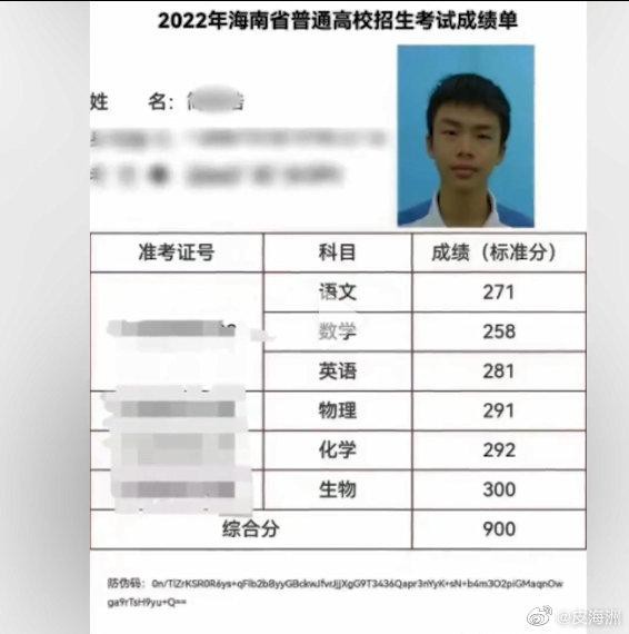 Ngày 25/6, một số tỉnh thành ở Trung Quốc đã bắt đầu công bố điểm thi đại học. Đáng nói, một thí sinh ở Hải Khẩu, Hải Nam đã đạt được 900 điểm trong kỳ thi tuyển sinh vào đại học ở Trung Quốc vừa qua. Trong đó: Ngữ văn 271 điểm; Toán 258 điểm; Ngoại ngữ 281 điểm; Vật lý 291 điểm; Hóa học 292 điểm; Sinh học 300 điểm. Tuy nhiên, cách tính điểm của Hải Nam khác so với tiêu chuẩn chung (tối đa 750 điểm). Vậy nên, nếu như quy đổi sang thang điểm tiêu chuẩn 750 thì nam sinh này đạt được khoảng 705 điểm.