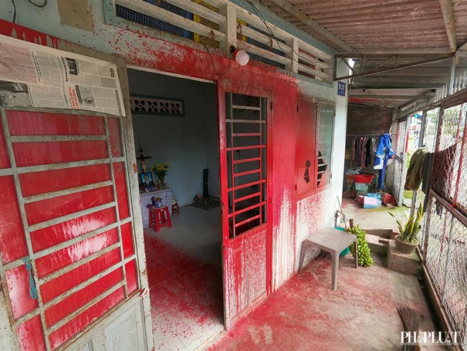 Toàn bộ phía trước căn nhà của bà Hương và em trai (hiện đã mất) phủ kín sơn đỏ do những người lạ mặt tạt trong thời gian dài. Ảnh NT
