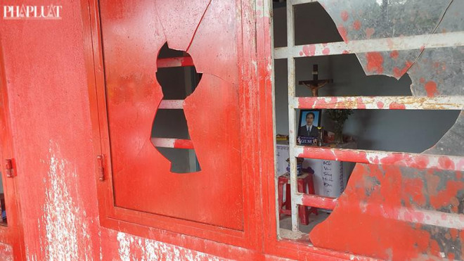Ghi nhận trong ngày 12-10, hai căn nhà liền kề dính đầy sơn đỏ, cửa kính bị đập vỡ…