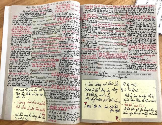 Tất cả những chỗ còn trống trên trang sách đã được ghi dày đặc những ý phân tích tác phẩm bằng hai loại mực đen và đỏ. Chưa kể, bạn học sinh này còn phải dán thêm 3 tờ giấy nhớ mới đủ ghi hết những ý cần lưu ý của mình. Nhìn thoáng qua thôi cũng đủ biết đây đích thị là học sinh giỏi Văn rồi.