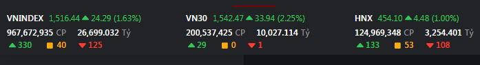 VN-Index tăng 24,29 điểm (1,63%) lên 1.516,44 điểm.