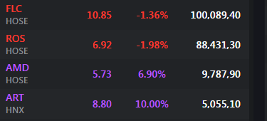 Tương tự, ROS cũng đổi màu cùng thời điểm với FLC nhờ khối lượng giao dịch cực khủng lên tới 88,4 triệu cổ phiếu. ROS giảm gần 2% về mốc 6.920 đồng/cổ phiếu.