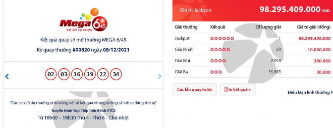 Kết quả xổ số Vietlott tối 8/12 cho thấy, tại kỳ quay số mở thưởng thứ 820 loại hình xổ số Mega 6/45, Công ty Xổ số điện toán Việt Nam (Vietlott) đã tìm được duy nhất chiếc vé trúng Jackpot trị giá 98.295.409.000 đồng.