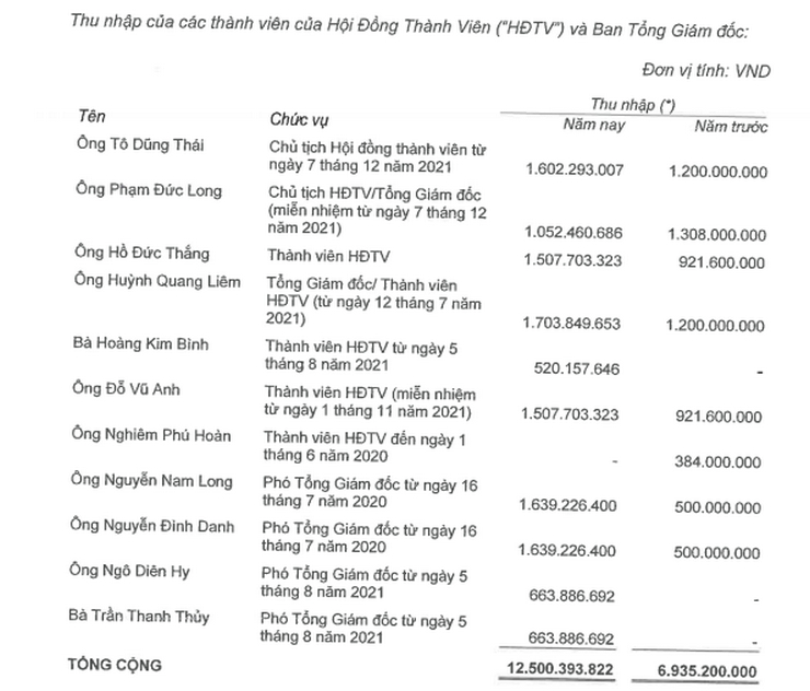 Cụ thể ông Tô Dũng Thái, Chủ tịch Hội đồng thành viên từ ngày 7/12/2021 có thu nhập hơn 1,6 tỷ đồng tăng mạnh so với con số 1,2 tỷ đồng của năm trước. Ông Phạm Đức Long, Chủ tịch Hội đồng thành viên/Tổng giám đốc miễn nhiệm từ ngày 7/12/2021 có thu nhập 1,052 tỷ đồng, giảm gần 300 triệu đồng so với năm trước.