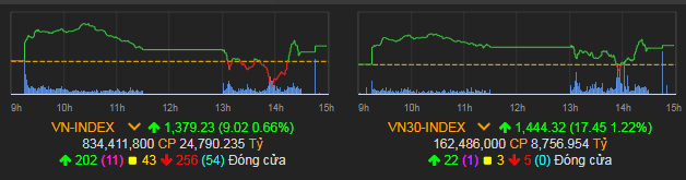 VN-Index tăng 9,02 điểm (0,66%) lên 1.379,23 điểm.
