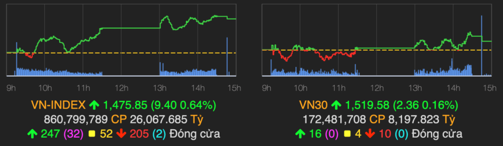 Kết quả là VN-Index chốt phiên tăng hơn 9 điểm (0,64%) lên trên 1.475 điểm. VN30-Index, cùng xu hướng những phiên gần đây, có phần khiêm tốn hơn với mức tăng chỉ 0,16%, lên gần 1.520 điểm. Trên sàn Hà Nội, HNX-Index tăng gần 2,4%, còn UPCOM-Index cũng vượt trên tham chiếu.