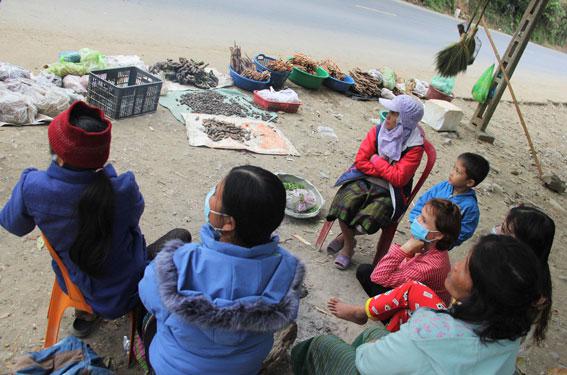 Phụ nữ thôn Vùng Kho bày bán sản vật rừng bên Quốc lộ 9