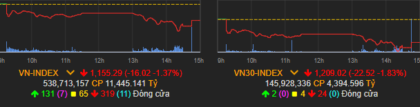 Kết thúc phiên giao dịch ngày 11/7, Vn-Index giảm 16,03 điểm (-1,37%) còn 1.155,29 điểm. HNX-Index giảm 0,87 điểm (-0,31%) còn 276,93 điểm. UPCoM-Index giảm 0,71 điểm (-0,82%) đạt 86,25 điểm.