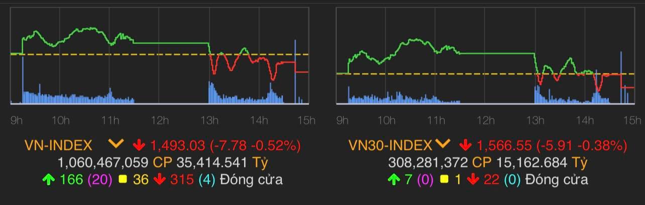 VN-Index giảm 7,79 điểm (0,52%) xuống 1.493,03 điểm.