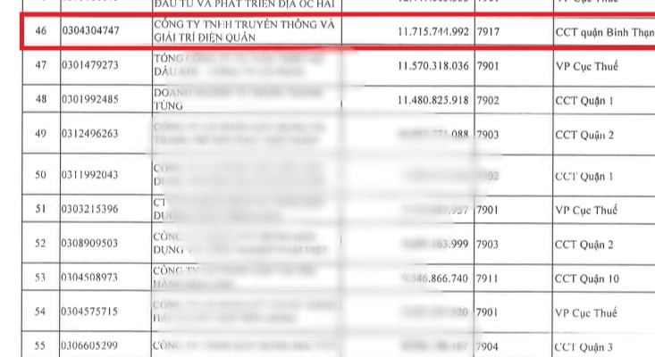 Trong công văn số 25669/TB-CT của Cục Thuế TP.HCM ngày 24/12/2019 đã thông báo về việc công khai thông tin người nộp thuế, nợ thuế trên phương tiện thông tin đại chúng kỳ 10/2019. Theo đó, Công ty TNHH Truyền Thông và Giải Trí Điền Quân đã nợ tổng cộng 14.559.408.753 đồng, tính đến thời điểm 30/11/2019.