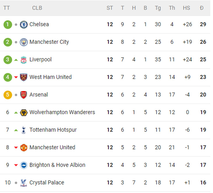 Bảng xếp hạng nửa trên của giải Ngoại hạng Anh mùa này sau 12 vòng đấu
