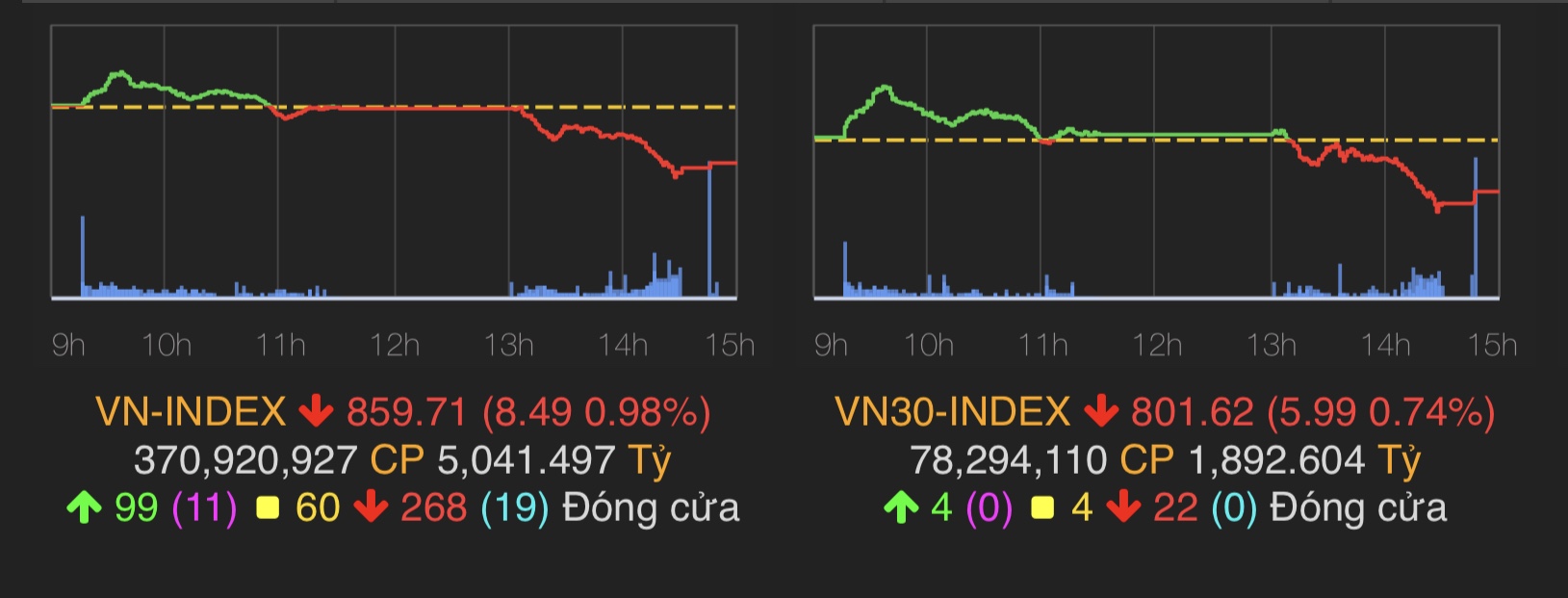 VN-Index giảm 8,49 điểm (0,98%) xuống 859,71 điểm.