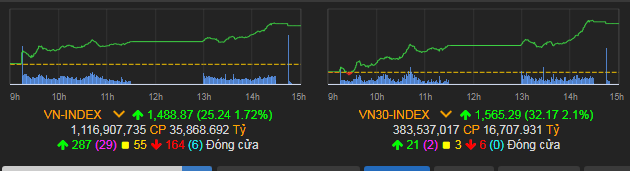 VN-Index tăng 25,24 điểm (1,72%) lên 1.488,87 điểm.
