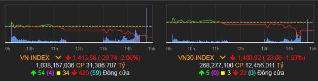 VN-Index giảm 29,74 điểm (2,06%) còn 1.413,58 điểm.