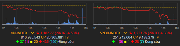 Đóng cửa, VN-Index giảm 56,07 điểm (4,53%) còn 1.182,77 điểm, HNX-Index giảm 13,13 điểm (4,16%) về 302,39 điểm, UPCoM-Index giảm 2,83 điểm (2,93%) về 93,61 điểm.