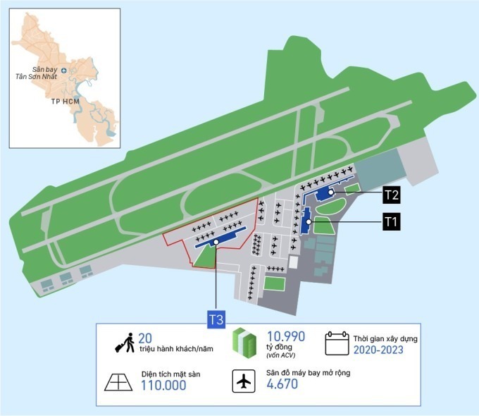 Quy hoạch nhà ga T3 trong sân bay Tân Sơn Nhất đang chuẩn bị khởi công. Đồ họa: Việt Chung
