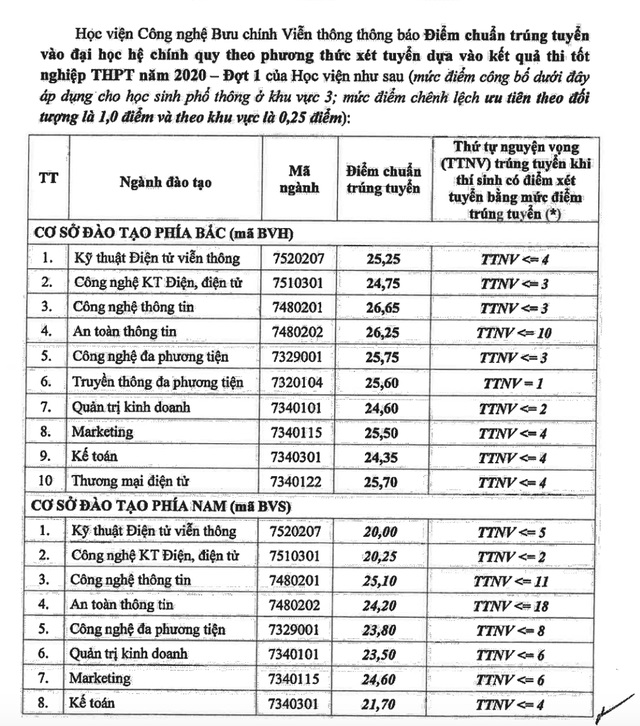 Điểm chuẩn của Học viện Công nghệ Bưu Chính Viễn thông như sau: