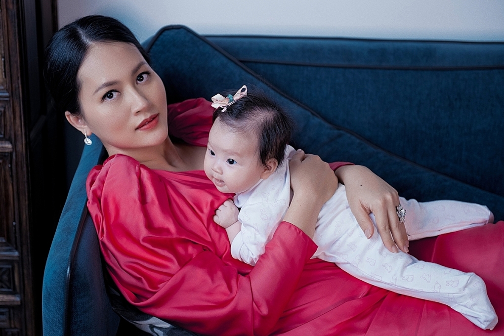 Diễn viên Đỗ Hải Yến bế con thứ ba chụp ảnh nhân dịp bé ba tháng tuổi. Ảnh: Trí Nghĩa