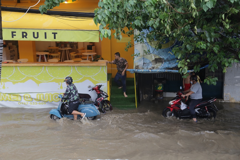 Hoạt động kinh doanh, buôn bán của các hộ dân hai bên đường Nguyễn Hữu Cảnh bị “đóng băng” vì nước ngập phía trước.