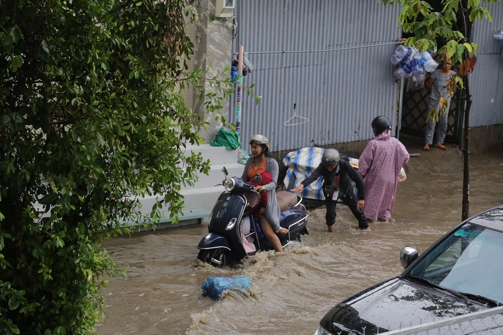 Đường phố Sài Gòn ngập lút bánh xe máy sau cơn mưa 30 phút