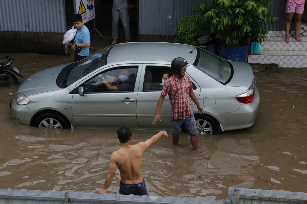 Xe ô tô cũng bị chết máy. Nhiều thanh niên tốt bụng ra đứng tại những khu vực ngập sâu để cảnh báo cho người đi đường cũng như giúp bà con đẩy xe qua đoạn ngập nước.