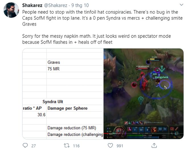 Tình huống đó khiến nhiều người cho rằng SofM đã nắm bắt được một “bug” nào đó của game và khiến cho bom mù làm mất sát thương chiêu cuối của Syndra. Điều đó khiến cho đích thân một nhân viên của Riot Games phải đăng đàn giải thích cụ thể về công thức tính sát thương, trong đó phải kể đến việc kỹ năng Q của Syndra đã nâng tối đa cấp, thêm cả sát thương từ vọng âm khiến cho SofM mất nhiều máu như vậy trong combo Q+E. Tuy nhiên chiêu cuối Syndra lúc đó chỉ ở cấp 1, không có xuyên kháng phép, trong khi Graves lướt đi sẽ tăng kháng phép lên cao, cộng thêm trừng phạt đụng độ sẽ làm giảm sát thương của Syndra. Nó cho thấy khả năng tính toán sát thương cực chuẩn của SofM.