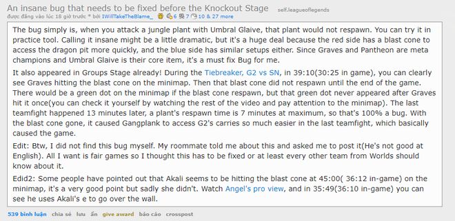 Sau khi xem lại thì đúng là đã có tình trạng đó, tuy nhiên Riot Games chưa lên tiếng xác nhận nó có phải là lỗi game hay không. Thế nhưng rất nhiều người không đồng tình về việc SofM lợi dụng bug để phá đi hạt thông, bởi tất cả mọi người chơi đều có quyền đánh vào hạt thông, và không ai có thể tính được rằng sẽ có một pha giao tranh ở đó 13 phút sau cả.