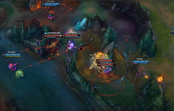 Cụ thể, trong trận đấu Tiebreak, SofM đã có khá nhiều tình huống đáng chú ý. Đầu tiên là ở bụi cỏ gần đường trên, khi SofM đang biến về thì bị Syndra của Caps bắt được và lao vào dùng combo Q+E làm choáng, lấy đi nửa thanh máu. Ngay sau đó, Syndra đã dùng chiêu cuối với 4 quả cầu, ai cũng cho rằng SofM chắc chắn sẽ lên bảng đếm số. Tuy nhiên chỉ trong vòng 1 giây, SofM đã trừng phạt, bắn bom mù lên Syndra và tốc biến vào bụi cỏ để tấn công đối phương. Bỗng nhiên sát thương của chiêu cuối Syndra giảm hẳn đi đến mức chỉ lấy được một chút máu của SofM.
