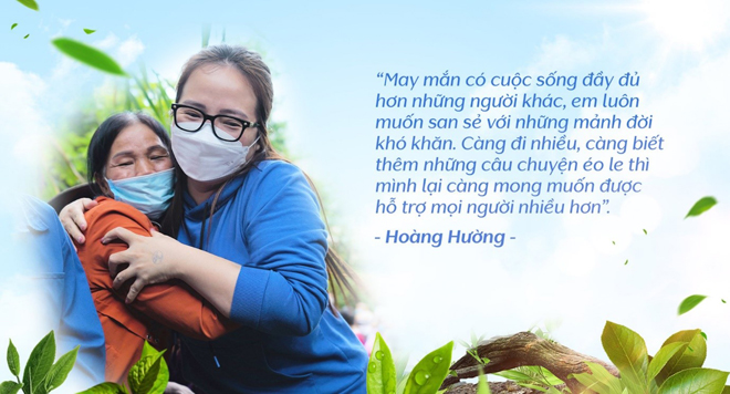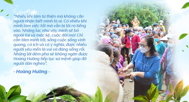 Với quan niệm sống là cho đi, nữ doanh nhân thường xuyên tự bỏ kinh phí tổ chức những hoạt động thiện nguyện xây nhà cho người nghèo, giúp đỡ trẻ em vùng cao, vùng lũ lụt, những chuyến xe hồi hương trong thời gian dịch bệnh: “May mắn có cuộc sống đầy đủ hơn những người khác, em luôn muốn san sẻ với những mảnh đời khó khăn. Càng đi nhiều, càng biết thêm những câu chuyện éo le thì mình lại càng mong muốn được hỗ trợ mọi người nhiều hơn”. Theo chị, làm từ thiện cũng là cách giúp bản thân thư giãn khi được trở về những miền quê giản dị, gần gũi những con người chất phác.