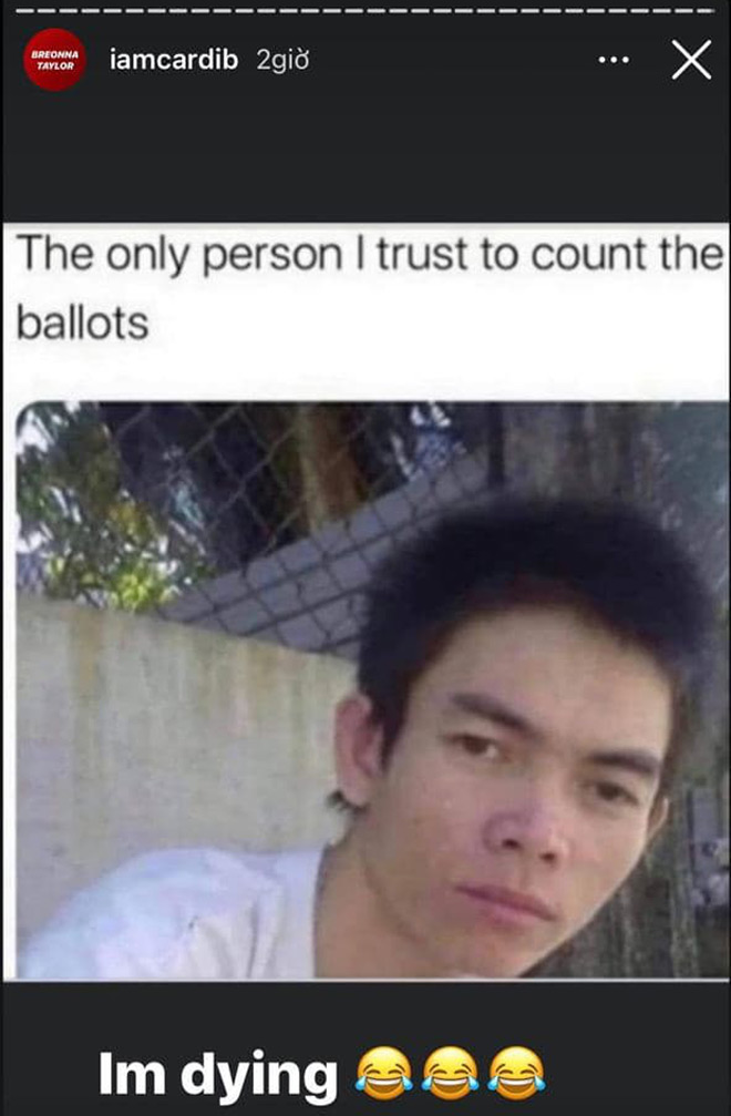 Nữ ca sĩ Cardi B bất ngờ đăng ảnh của SoYtiet cùng lời nhắn "Người duy nhất tôi tin tưởng trong việc đếm số phiếu". Phía dưới bức hình, rapper này còn bình luận: "Tôi đến chết mất thôi" để thể hiện việc chờ đợi mòn mỏi kết quả bầu cử tổng thống Mỹ.