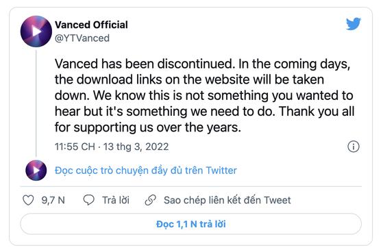 Vừa qua, các nhà phát triển ứng dụng YouTube Vanced đã chính thức thông báo trên Telegram và Twitter về việc dừng hoạt động. Không có lý do rõ ràng nào được đưa ra, tuy nhiên theo trang Android Police, nhiều khả năng việc này liên quan đến các vấn đề pháp lý với Google.