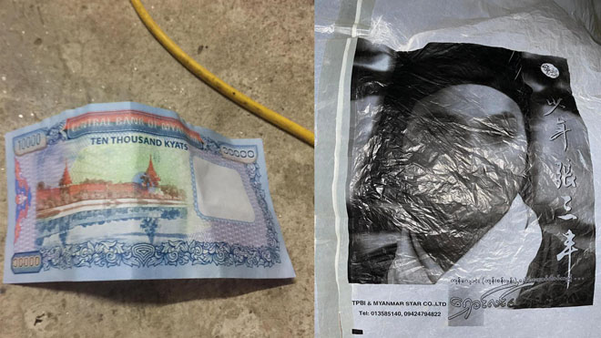 Tại hiện trường có một túi nilông dài khoảng 15m, miệng rộng khoảng 4m được kết thành hình bởi nẹp tre. Bên ngoài túi được in hình nhân vật Triển Chiêu, kèm theo đó có những miếng vải nhiều màu sắc nối vào nhau giống như đuôi diều và có một tờ tiền 10.000 Myanmar.