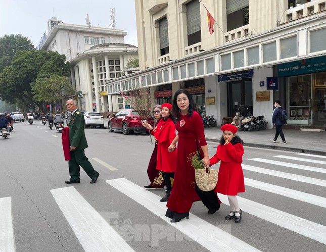 Lượng người đổ về Hồ Gươm cũng không đông đúc, nhộn nhịp như mọi năm. Không khí xuân chỉ bắt gặp ở vài bạn trẻ, với áo dài, khăn đóng, chụp ảnh với cành đào nhỏ ở khu vực trước cửa toà soạn báo Hà Nội mới, gần tháp Rùa hay một vài gánh hàng hoa, xe chở đào, quất vụt qua đường.