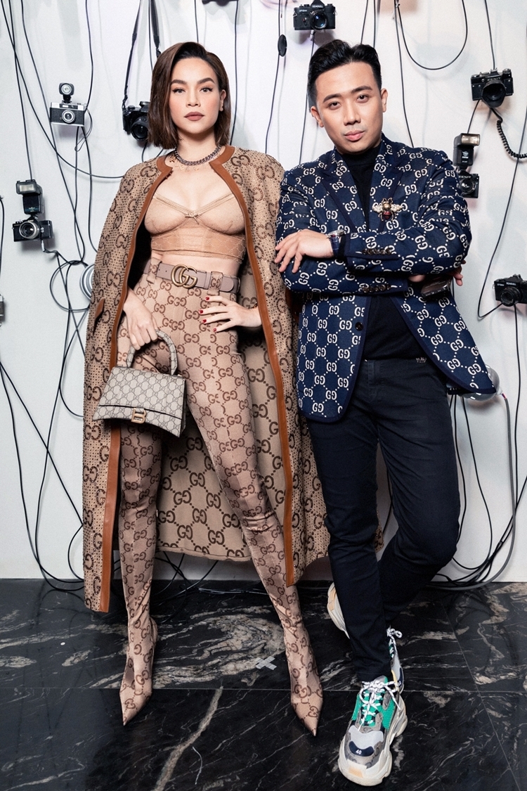 Hà Hồ (trái) bên diễn viên Trấn Thành. Nữ ca sĩ khoe vóc dáng trong mẫu bra-top bằng ren, phối legging và áo choàng nằm trong bộ sưu tập "Aria" do Gucci và Balenciaga kết hợp sáng tạo hồi tháng 4. Người đẹp lăng xê mốt diện Pantaleggings (quần legging trùm bàn chân). Phong cách này khá kén dáng, từng được Kim Kardashian giới thiệu tại Met Gala. Những phụ kiện đi kèm như túi xách, thắt lưng... cũng được phối cùng tông màu trầm.